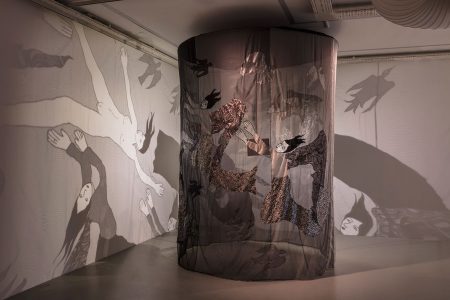 Tülden bir silindir şeklinde tavandan yere doğru uzanan ve kendi ekseni etrafında yavaşça dönen “Cennet” (2017) adlı yeni bir yapıt ise, ışık/gölge oyunu üzerinden görünenlerle görünmeyenler ve gerçek ile kurgusal dünya arasında bağlar kuruyor. Gökkuşağı renklerindeki “Cennet” in üzerinde payetli kumaşlarla işlenmiş insanlar, hayvanlar ve yaratıklar tülün içinde yerleştirilmiş ışık kaynağı sayesinde gölgelerini dışarıya yansıtıyorlar. Çıplak bedenler eril ve dişil özellikleriyle birbirine karışıyor, figürlerin gölgeleri yapıta yaklaşan izleyicilerin gölgeleriyle iç içe geçiyor.